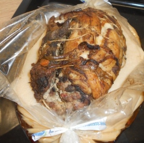 Żeby trochę urozmaicić monotonne menu popełniłem roladę z boczko-żeberek(bez kości) z dzika. Farsz: karkówka 800g i kurzęcina 300g. Połeć zamarynowałem w warzywach pokrojonych - lepsze byłyby potarkowane, czosnek, sól, pieprz, zioła ulubione. Po związaniu piekłem ponad trzy godziny w temp. 130*C. Trochę za długo, bo dziczek był młody. Następnym razem roladę ułożę szwem do dołu, bo mi się trochę rozszedł. Mimo, że dziczyzna powinna być chuda, wytopiło się sporo smalcu. Przy pieczeniu mięsiw w rękawie uzyskujemy trochę bulionu, wywaru, który używamy do sporządzania ciemnych sosów.