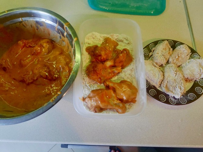 Przygotować pojemnik z przykrywką, ja mam prostokątny wysoki na 4cm i jest bardzo dobry do tego, wsypać ok 1cm maki, umieścić kilka skrzydełek na mące zakryć pokrywka i potrząsając gora dół oraz na boki, ok 10 sekund nadać im odpowiednią strukturę. Nie trząść za długo bo powstanie skorupa a nie panierka.